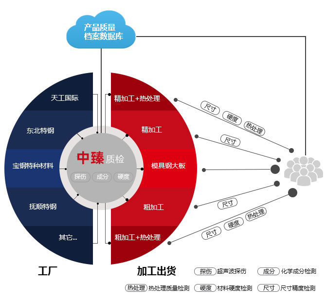 品質(zhì)管控體系總結(jié)概括是“一證,三重,五檢,大數(shù)據(jù)”,它是山東中臻18年經(jīng)驗的結(jié)晶。所謂“一證”是指中臻每一種牌號的每一批貨都會要求廠家提供品質(zhì)保證書;“三重”是指中臻從進貨到加工到出貨,會進行三重品質(zhì)檢測,保證最優(yōu)品質(zhì)的材料送達用戶手中;“五檢”是指品質(zhì)檢測中五項內(nèi)容,分別是超聲波探傷檢測,化學(xué)成分檢測,預(yù)硬料硬度檢測,熱處理質(zhì)量檢測和尺寸精度檢測;“大數(shù)據(jù)”是中臻的產(chǎn)品質(zhì)量檔案數(shù)據(jù)庫,它集合了原材料從工廠到中臻再到用戶全過程中的品質(zhì)反饋信息,并通過大數(shù)據(jù)系統(tǒng)整合分析,再反饋生產(chǎn)線改善,并不斷的循環(huán)改善。